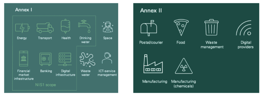 Obe skupini morata upoštevati enake varnostne ukrepe. Vendar so subjekti v bistveni kategoriji pod proaktivnim nadzorom, medtem ko se pomembni subjekti spremljajo šele po prijavi incidenta neskladnosti. Organizacije morajo nemudoma ugotoviti, ali spadajo v področje uporabe in ali so razvrščene kot bistveni ali pomembni subjekti.